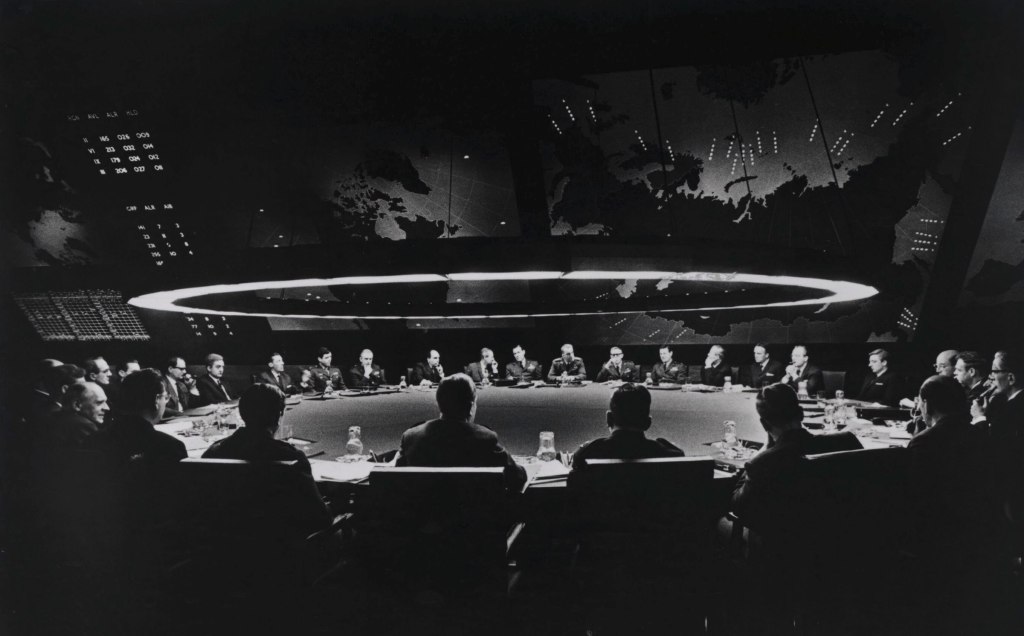 يتميز الحوار في الفيلم بكونه من أفضل ما كُتب في تاريخ السينما، مليئاً بعبارات أيقونية أصبحت جزءاً من الثقافة الشعبية. عبارات مثل “Gentlemen, you can’t fight in here! This is the War Room!” تكشف عن التناقض السخيف في المنظومة العسكرية، حيث يُمنع القتال في غرفة مخصصة للحرب. أو “Mein Führer… I can walk!” التي تأتي في لحظة درامية كوميدية، أو حتى “You’re gonna have to answer to the Coca-Cola company” التي تسخر من الرأسمالية الأمريكية. كل جملة محملة بسخرية لاذعة وذكاء حاد، مما يجعل الحوار يدفع السرد إلى الأمام بإيقاع سريع يمزج بين التوتر والضحك. كتب كوبريك السيناريو بالتعاون مع تيري ساوثرن وبيتر جورج، مقتبساً من رواية “Red Alert”، لكنه حوّلها من دراما جادة إلى سخرية كاملة، مما يُظهر عبقريته في إعادة صياغة المواد الأدبية.