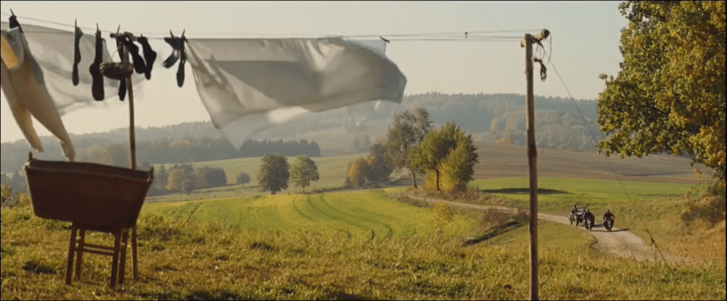 - بالاظافة إلى ذلك اود ان اذكر نقطة جميلة ممكن البعض لا يلاحظها بالمشهد الافتتاحي وهي عند قدوم هانز لاند واحدى بنات الرجل الفرنسي تزيح احد الملابس المعلقه ويبدأ اللحن مع صوت الابنه وهي تنادي والدها ثم فوكس الكاميرا يتغير – هذه الثواني من اجمل ما شاهدت بموضوع التصوير ودمج الصوت والموسيقى في نفس الوقت.